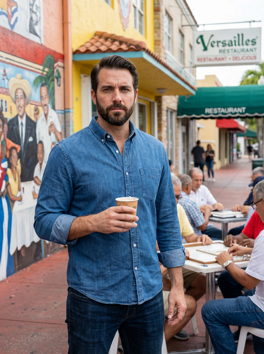 model at Little Havana, Calle Ocho, Cuban coffee in hand, colorful cultural setting