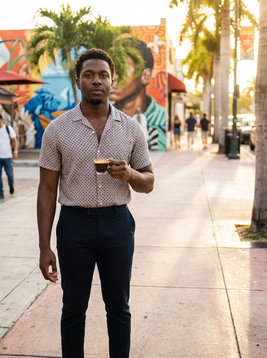 model at Little Havana, Calle Ocho, Cuban coffee in hand, colorful cultural setting