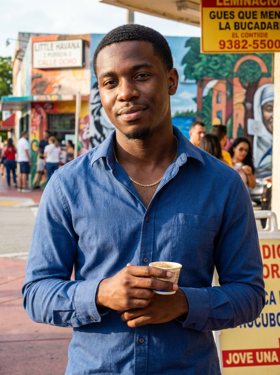 model at Little Havana, Calle Ocho, Cuban coffee in hand, colorful cultural setting