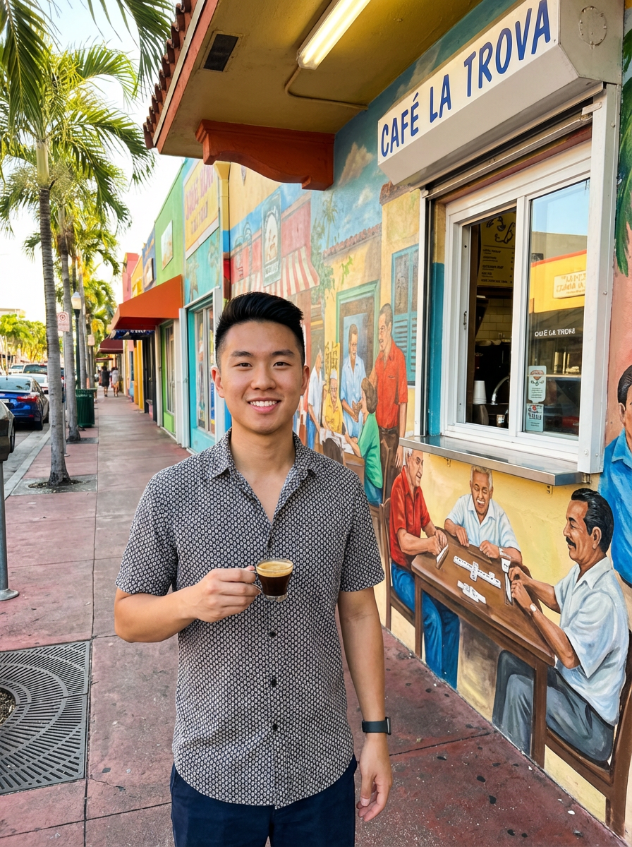 model at Little Havana, Calle Ocho, Cuban coffee in hand, colorful cultural setting