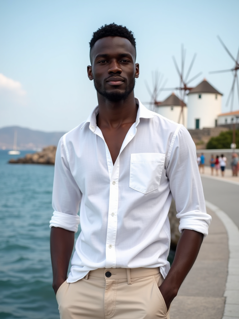 model at Little Venice waterfront, wearing a stylish white button-up with beige chinos, Aegean Sea and windmills in background