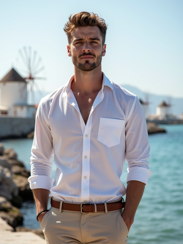 model at Little Venice waterfront, wearing a stylish white button-up with beige chinos, Aegean Sea and windmills in background