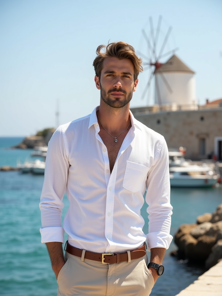 model at Little Venice waterfront, wearing a stylish white button-up with beige chinos, Aegean Sea and windmills in background