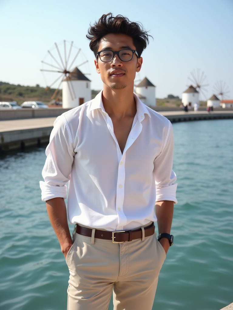 model at Little Venice waterfront, wearing a stylish white button-up with beige chinos, Aegean Sea and windmills in background