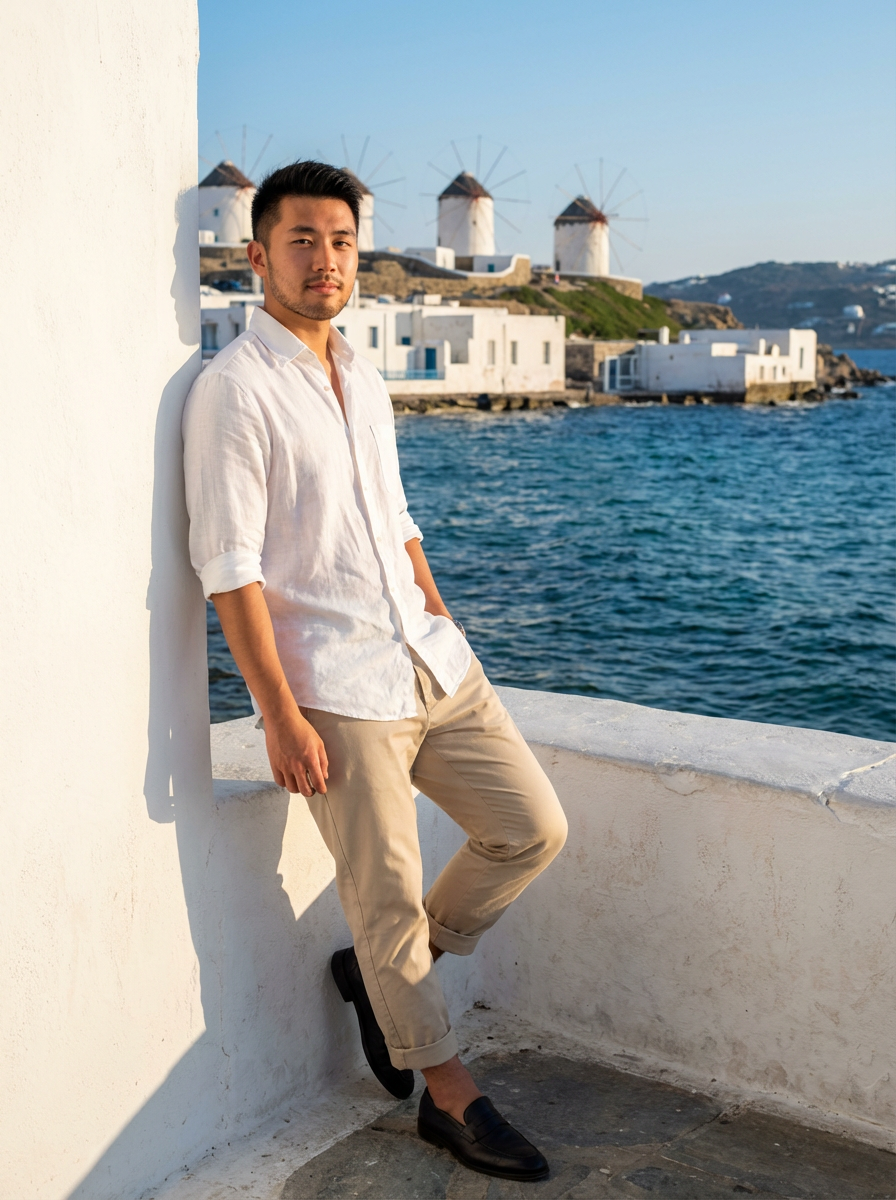 model at Little Venice waterfront, wearing a stylish white button-up with beige chinos, Aegean Sea and windmills in background