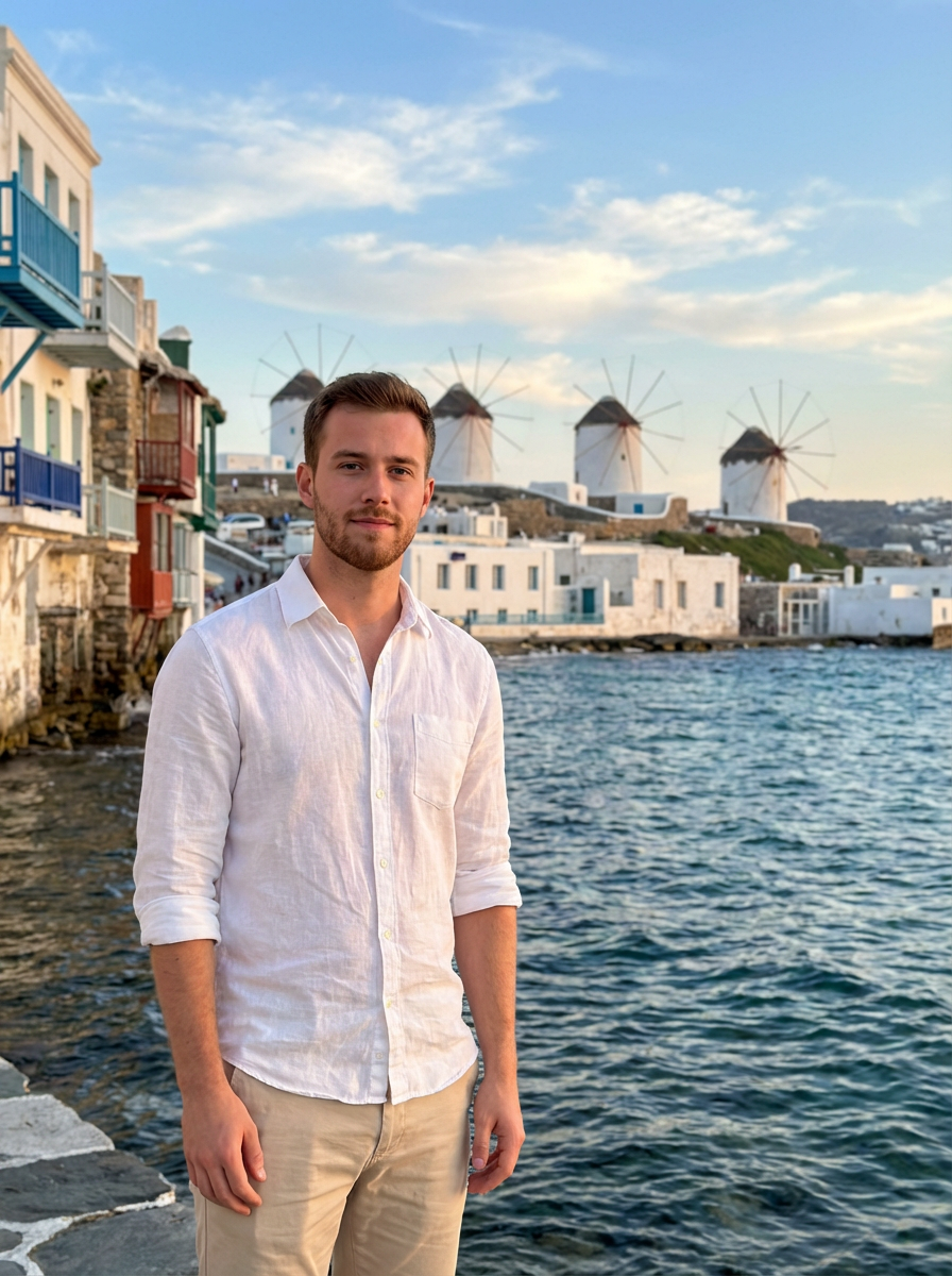 model at Little Venice waterfront, wearing a stylish white button-up with beige chinos, Aegean Sea and windmills in background