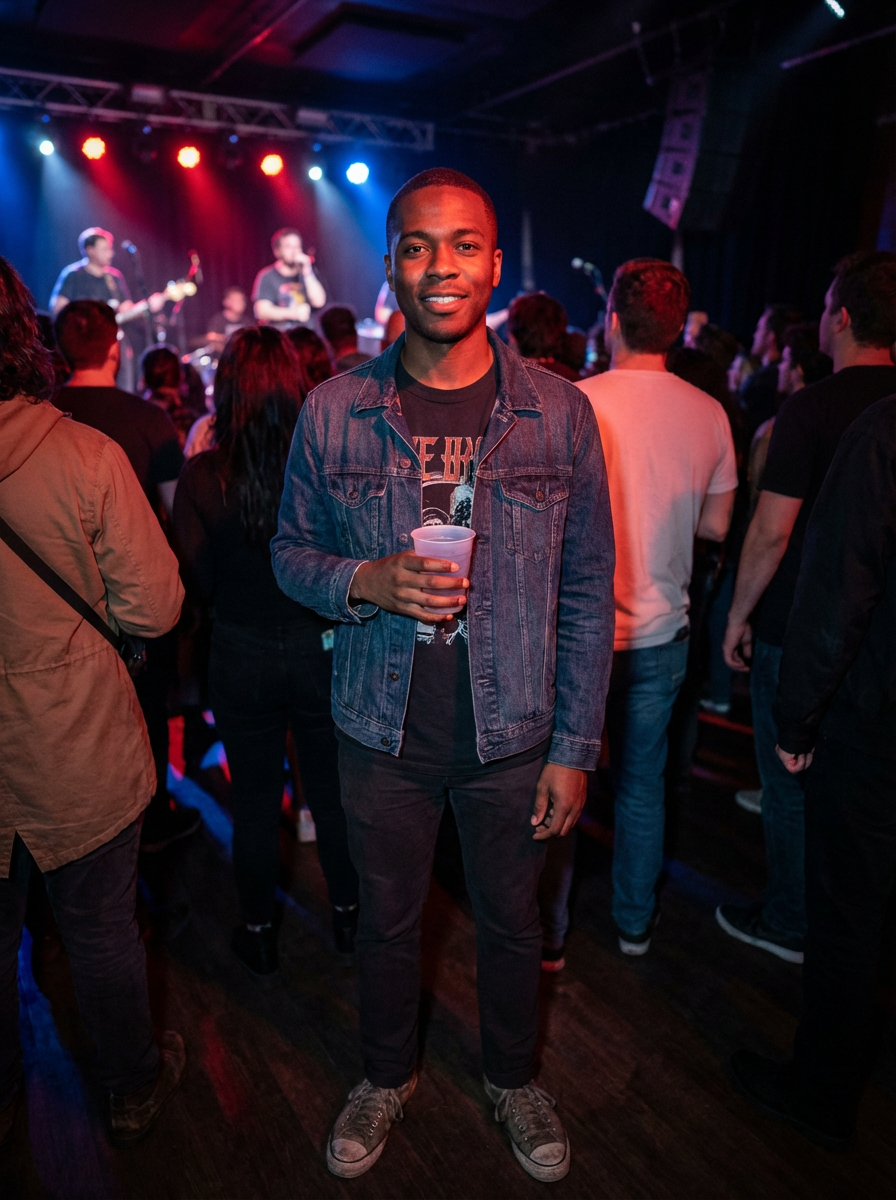 model at live music venue, music lover aesthetic, casual cool outfit, authentic atmosphere