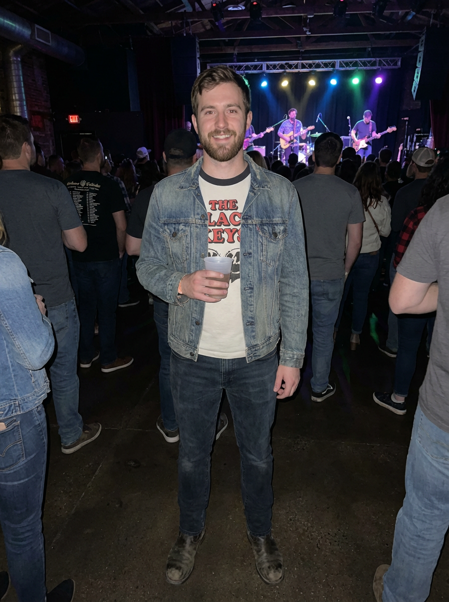 model at live music venue, music lover aesthetic, casual cool outfit, authentic atmosphere