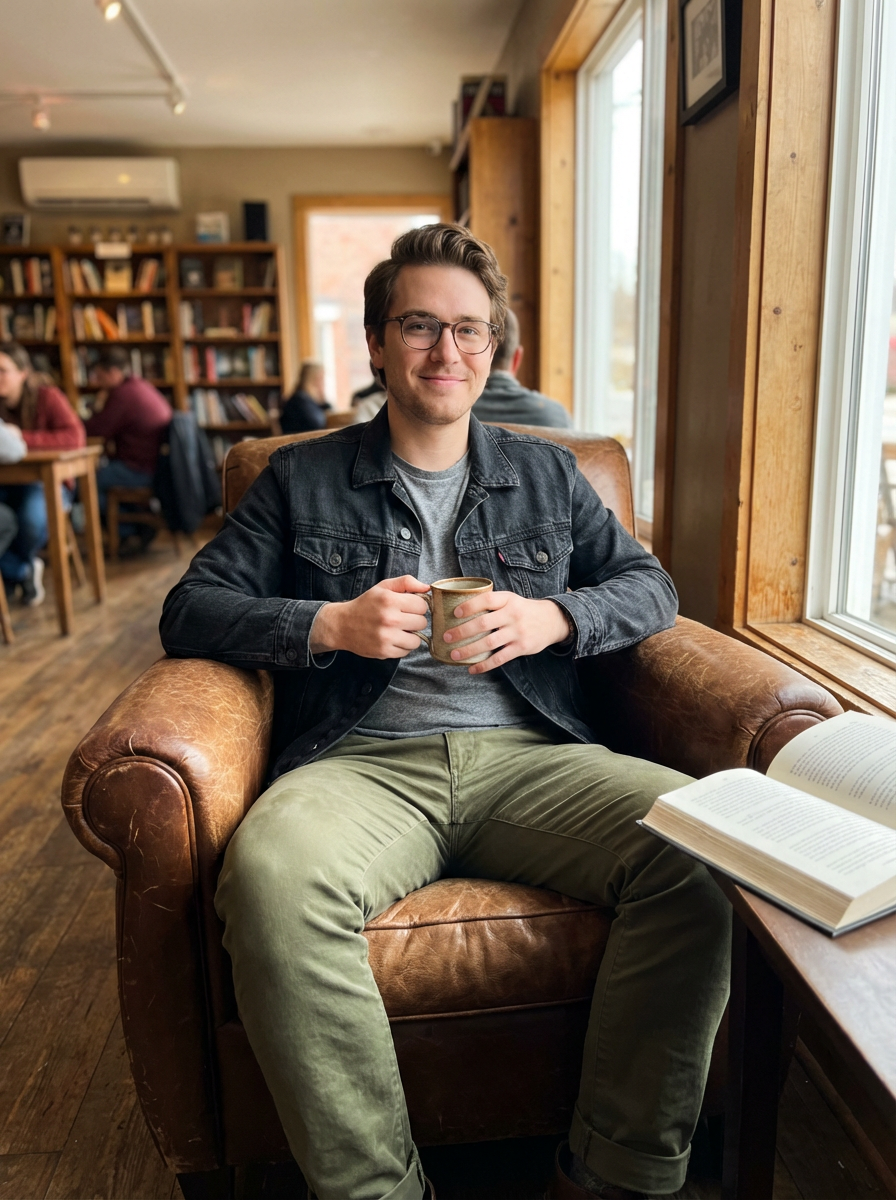 model at local coffee shop, intellectual casual vibe, comfortable in own skin, warm lighting
