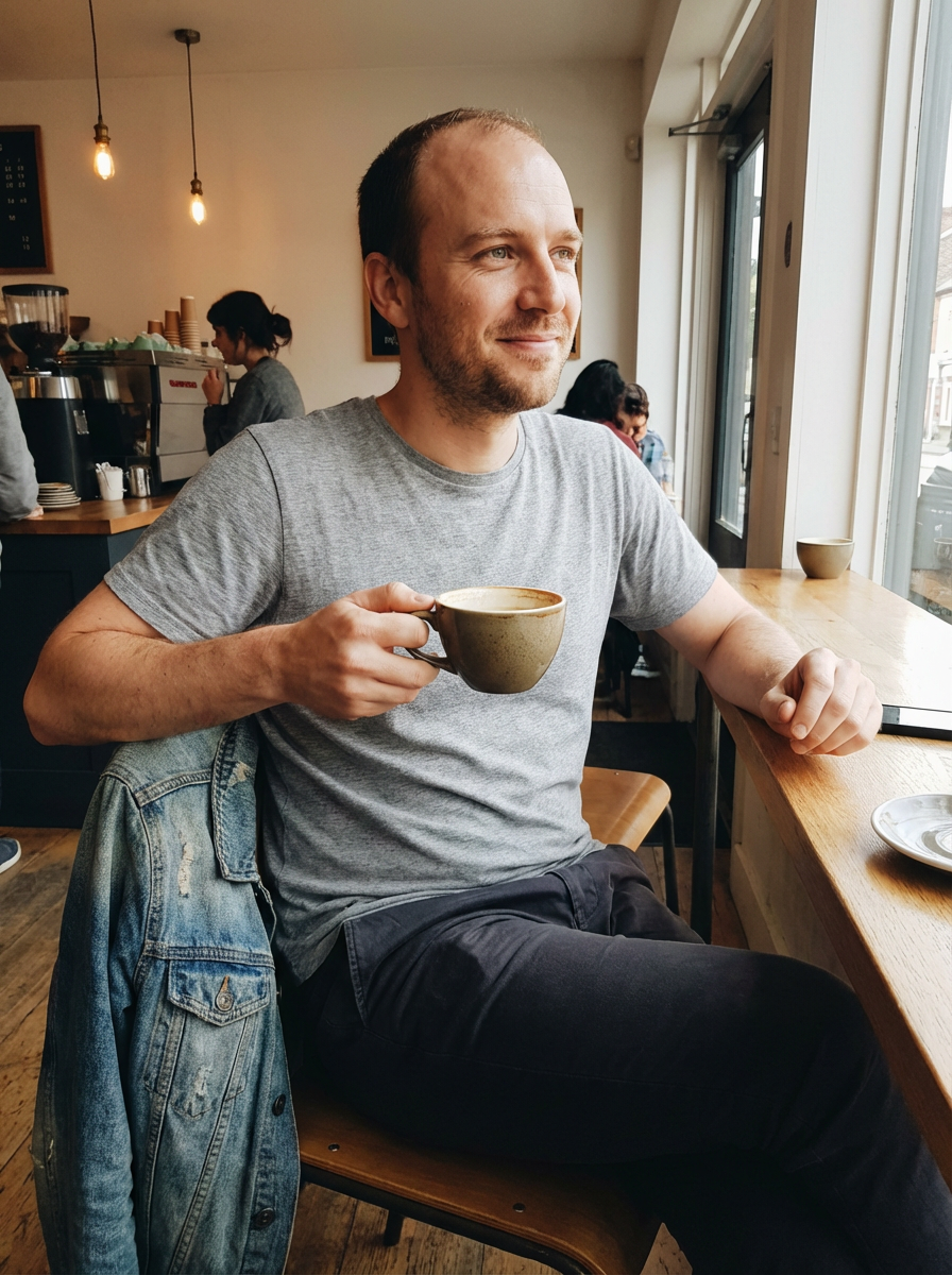 model at local coffee shop, intellectual casual vibe, comfortable in own skin, warm lighting