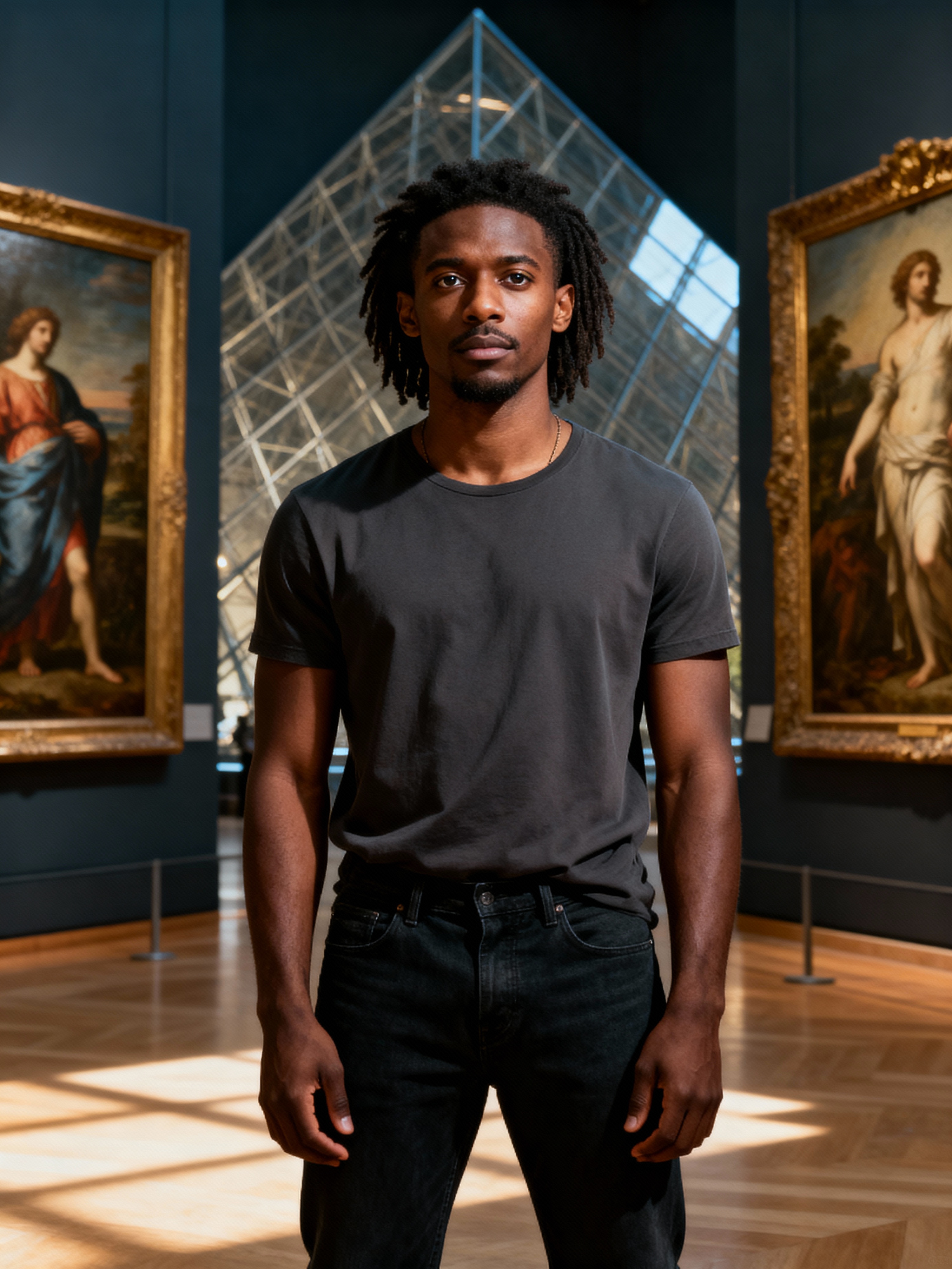 model at Louvre Museum, wearing dark jeans with a minimalist t-shirt, surrounded by art masterpieces