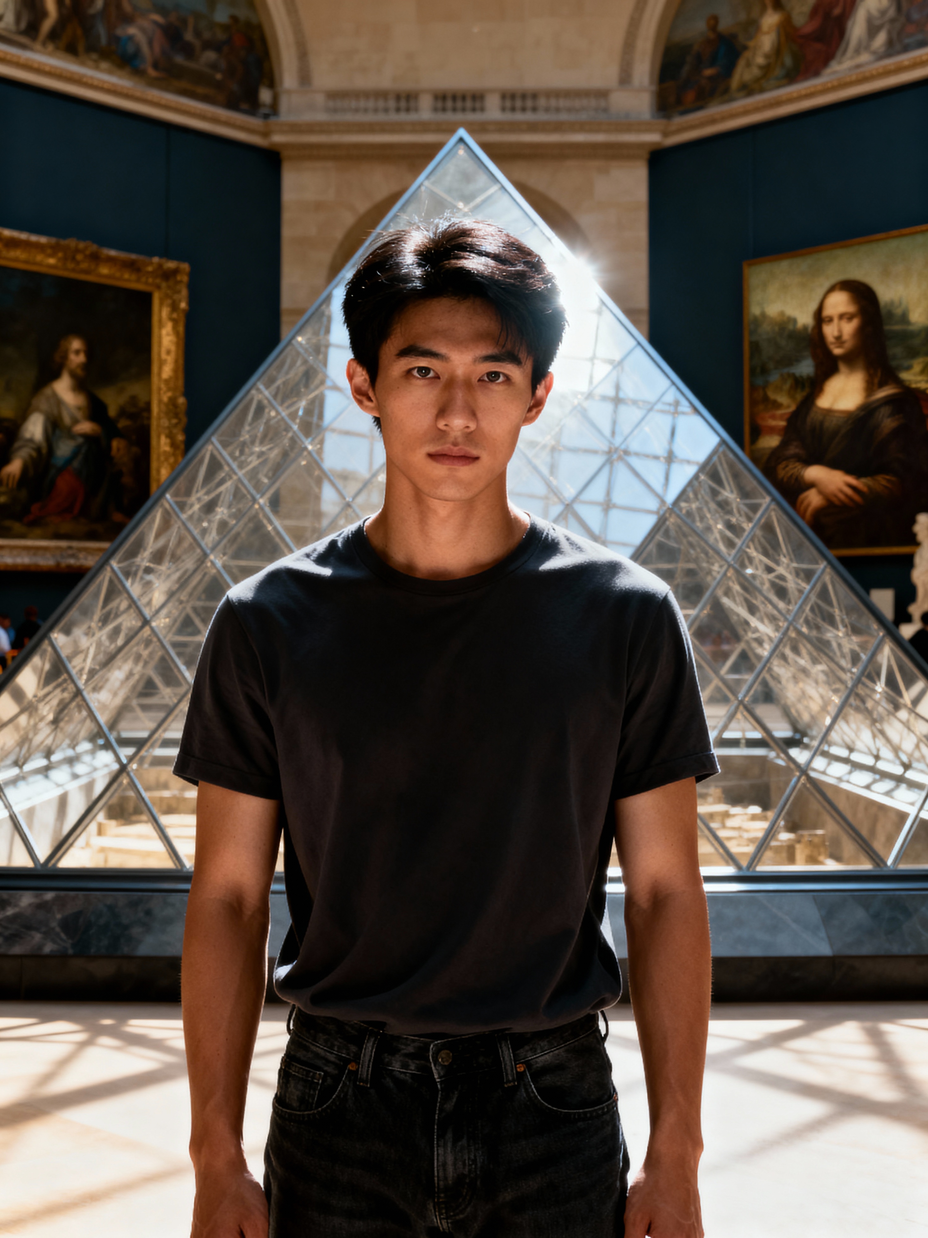 model at Louvre Museum, wearing dark jeans with a minimalist t-shirt, surrounded by art masterpieces