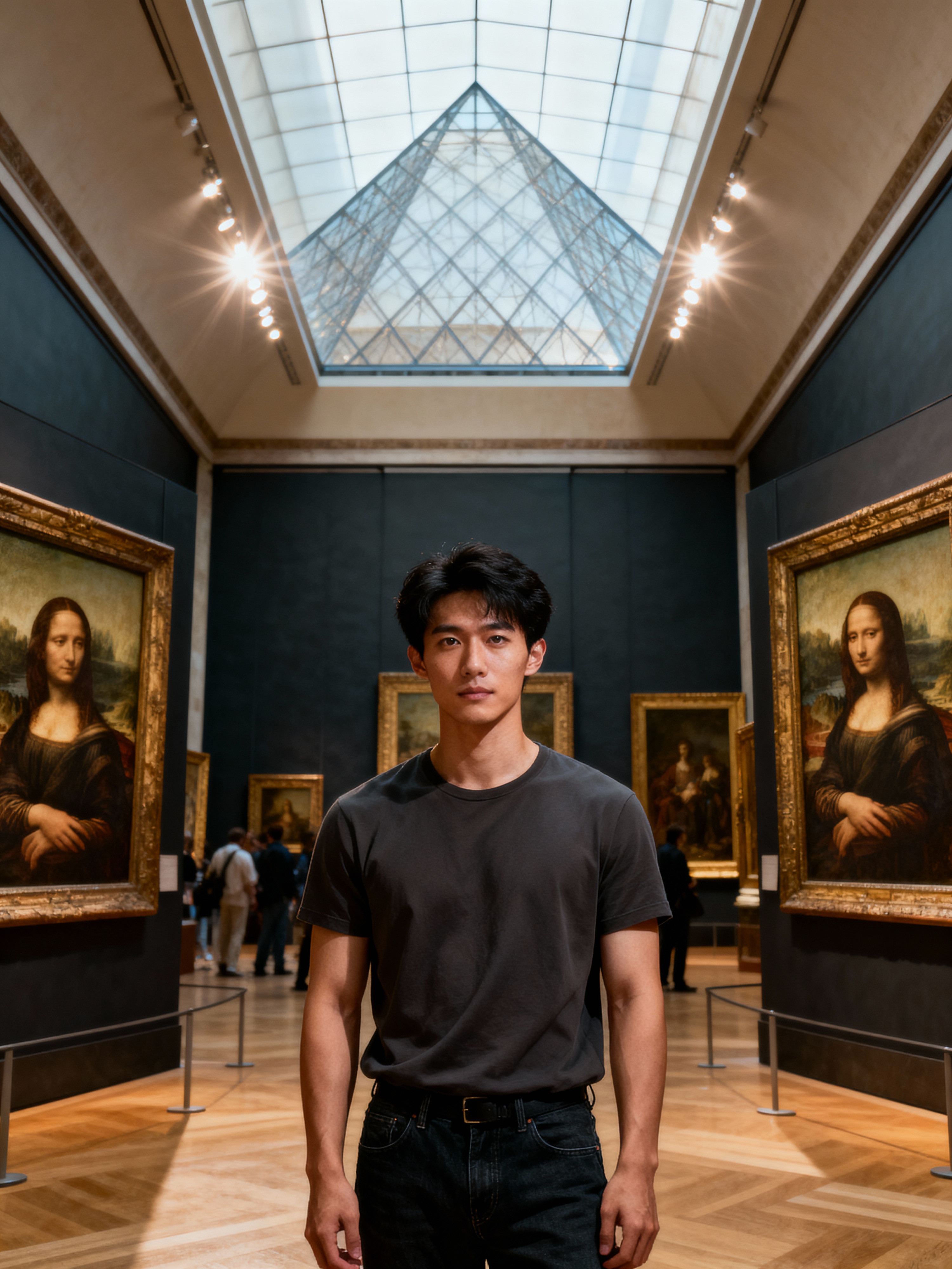 model at Louvre Museum, wearing dark jeans with a minimalist t-shirt, surrounded by art masterpieces