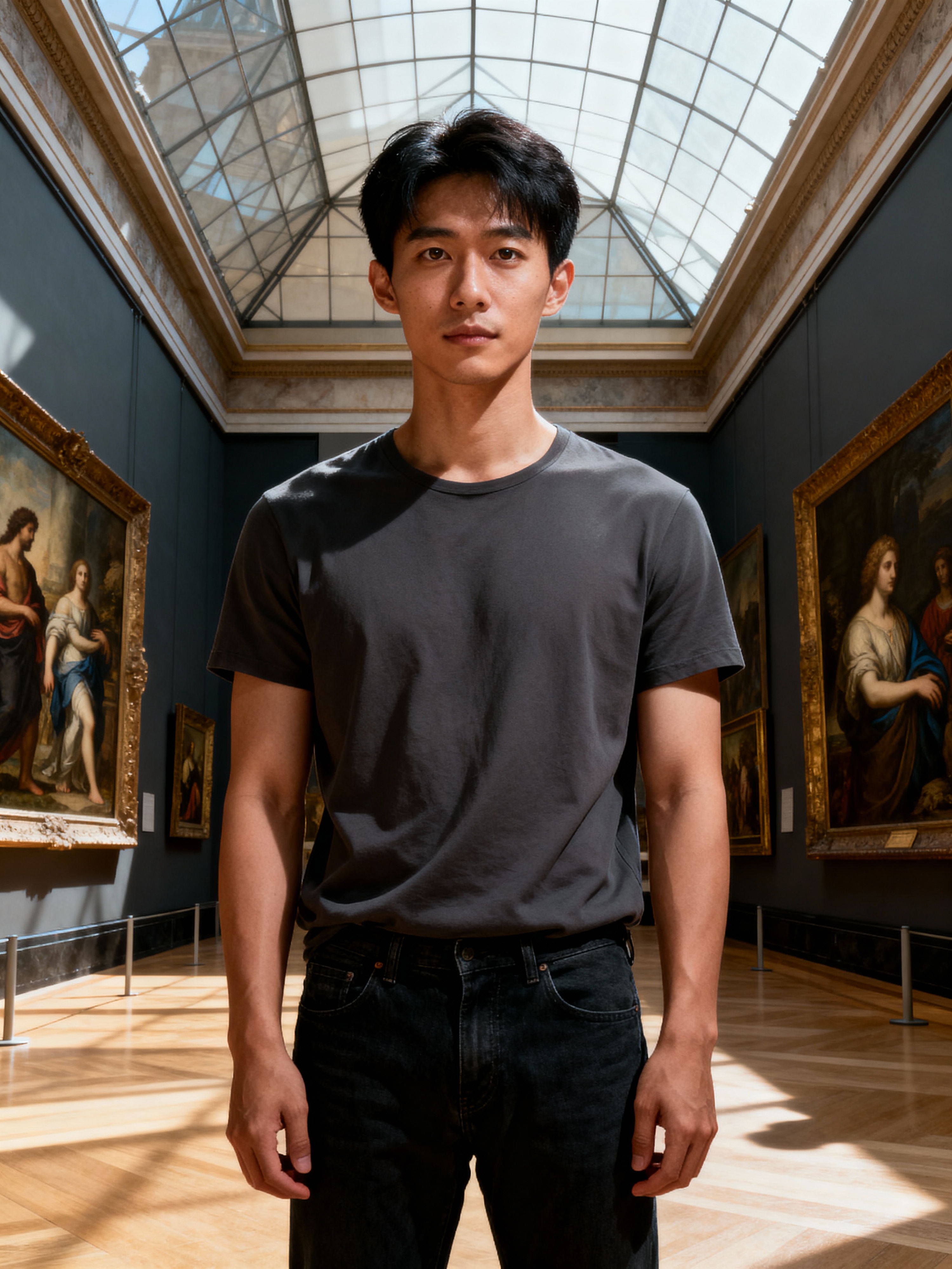 model at Louvre Museum, wearing dark jeans with a minimalist t-shirt, surrounded by art masterpieces