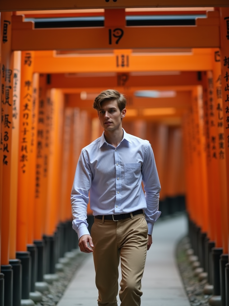 model at Meiji Shrine, wearing neat chinos with a collared shirt, walking through torii gates