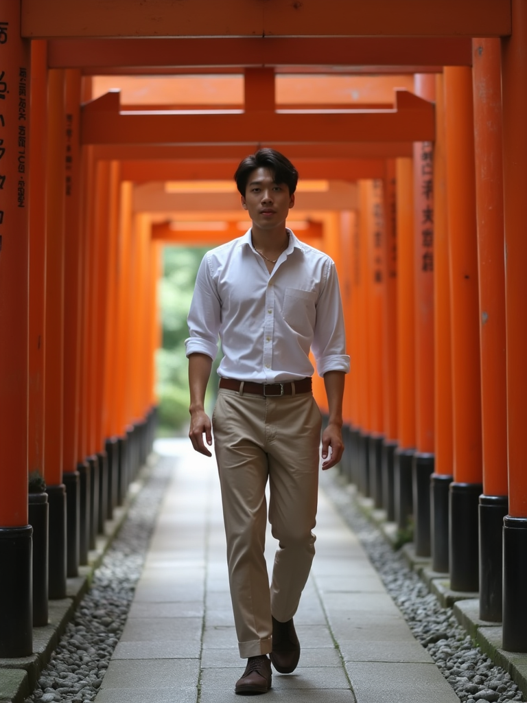 model at Meiji Shrine, wearing neat chinos with a collared shirt, walking through torii gates