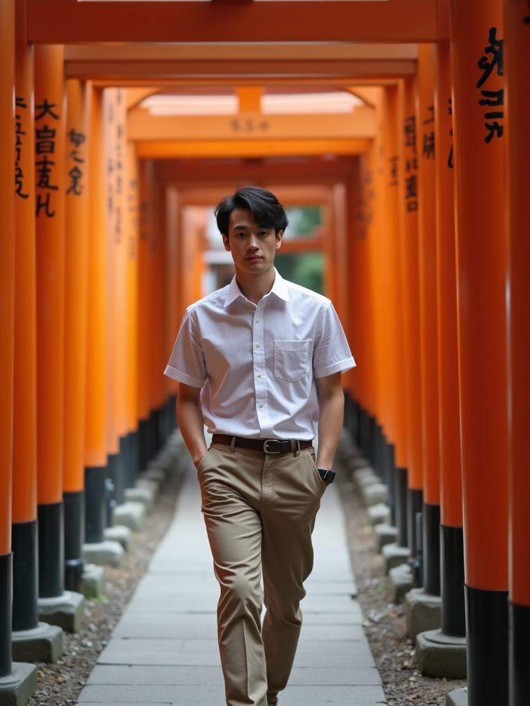 model at Meiji Shrine, wearing neat chinos with a collared shirt, walking through torii gates