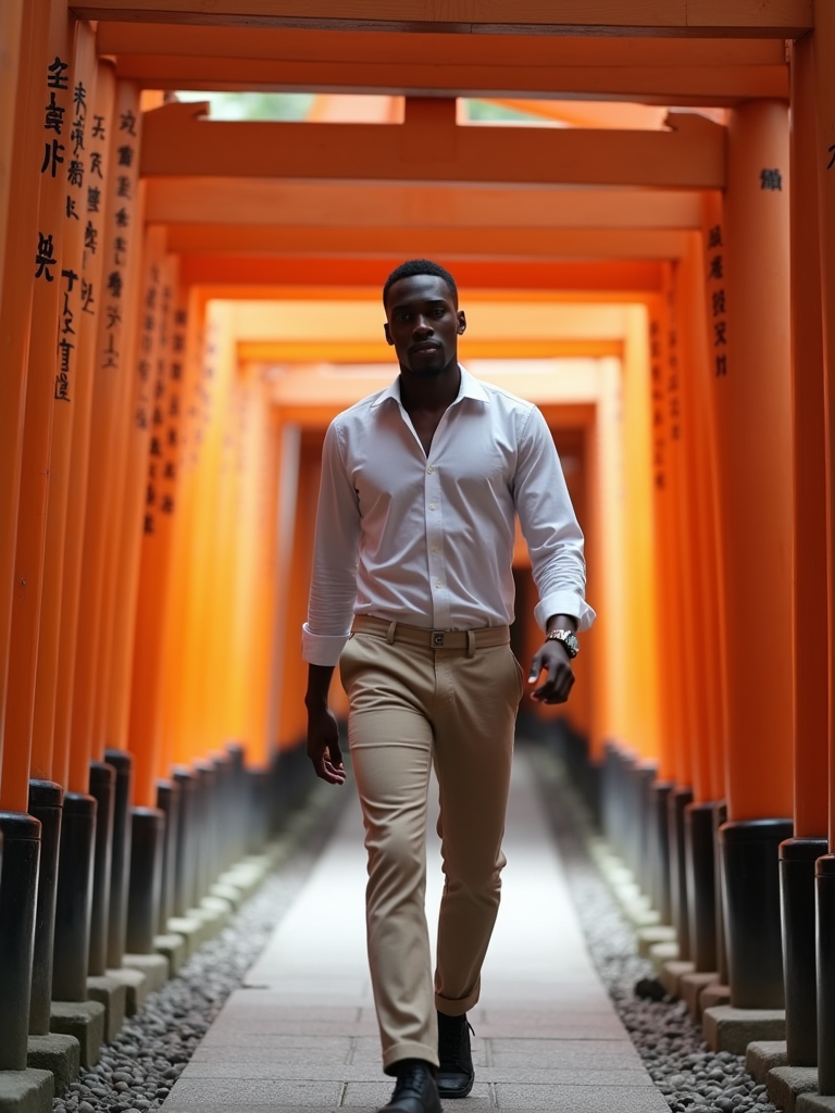 model at Meiji Shrine, wearing neat chinos with a collared shirt, walking through torii gates