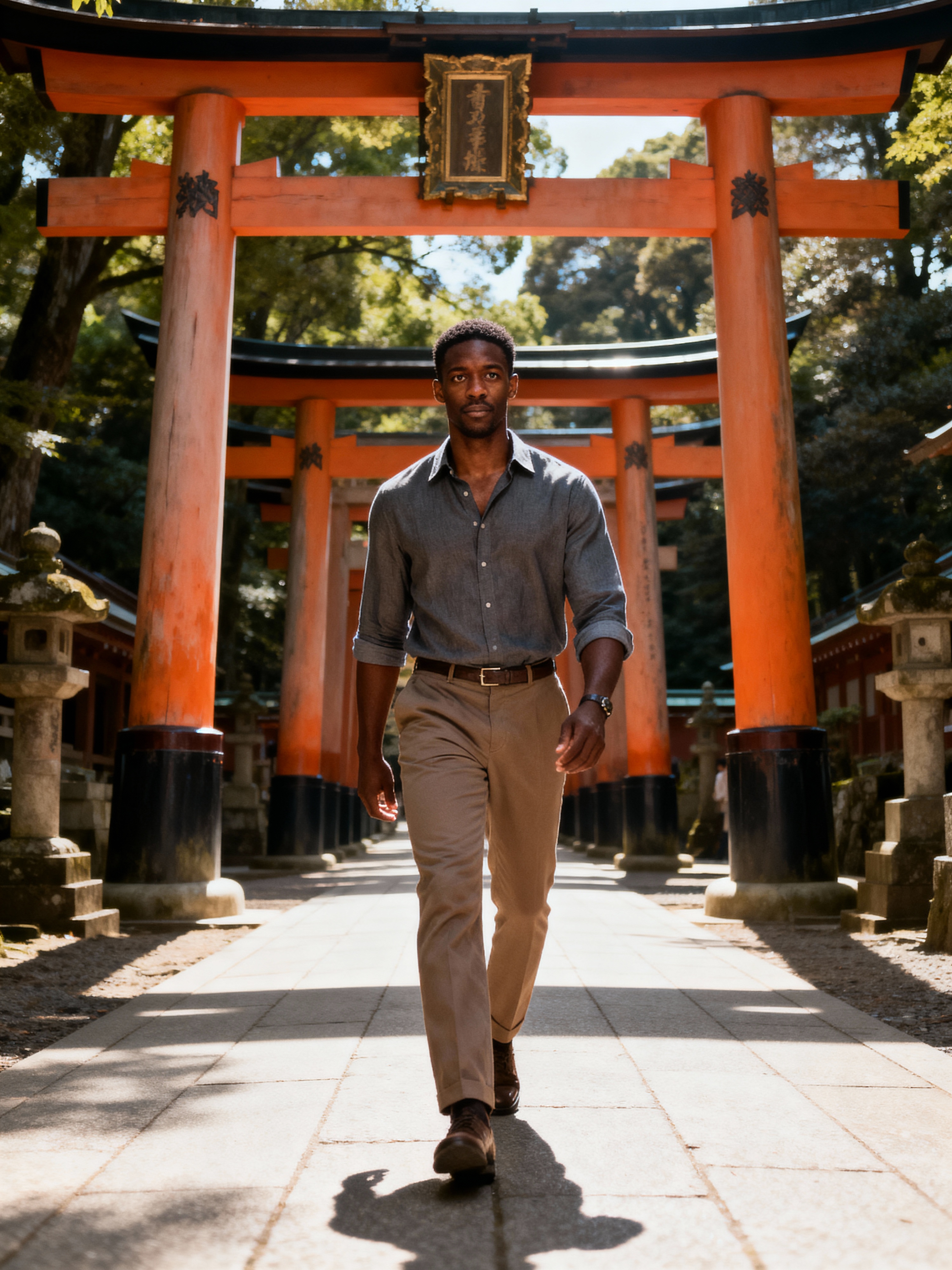 model at Meiji Shrine, wearing neat chinos with a collared shirt, walking through torii gates