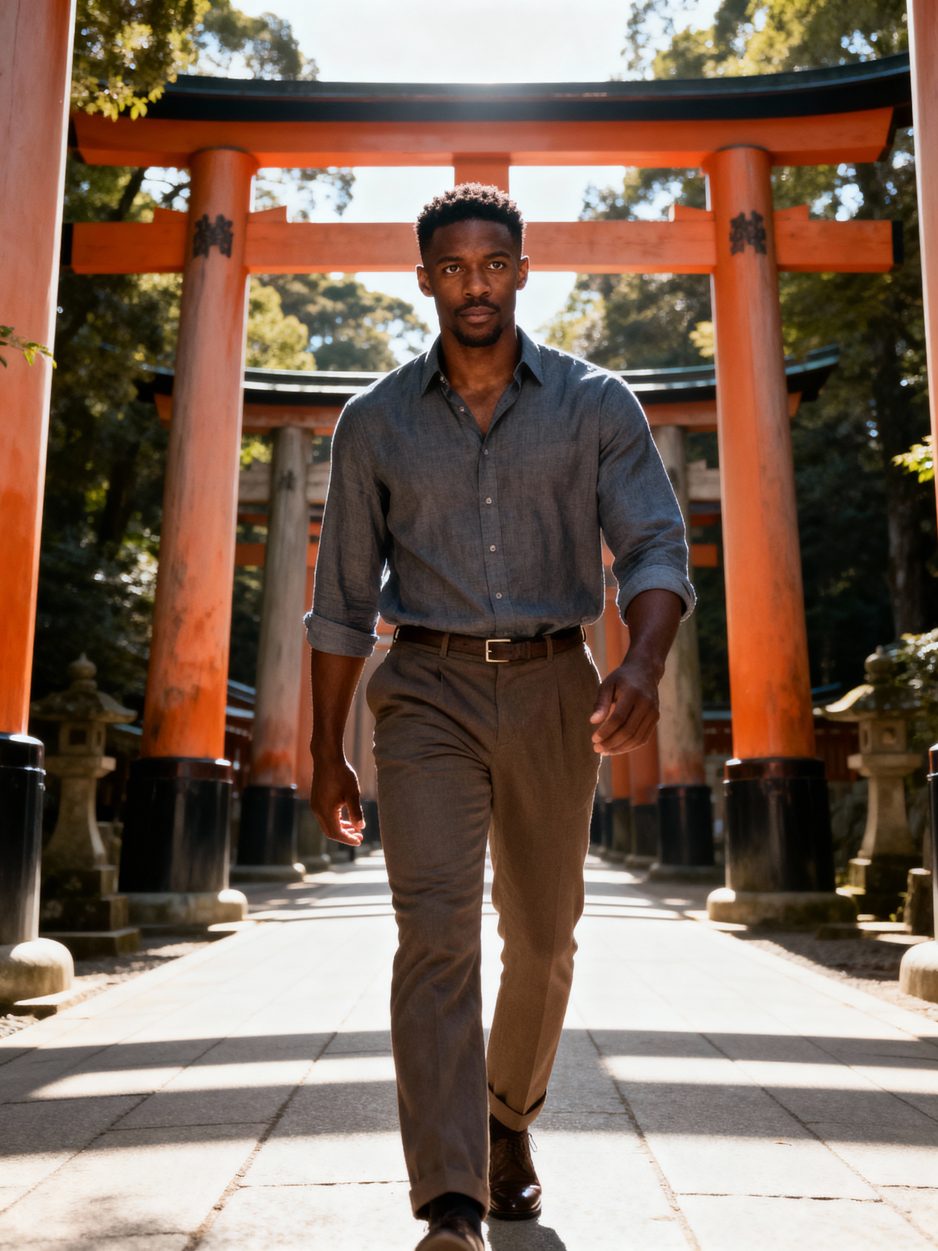 model at Meiji Shrine, wearing neat chinos with a collared shirt, walking through torii gates