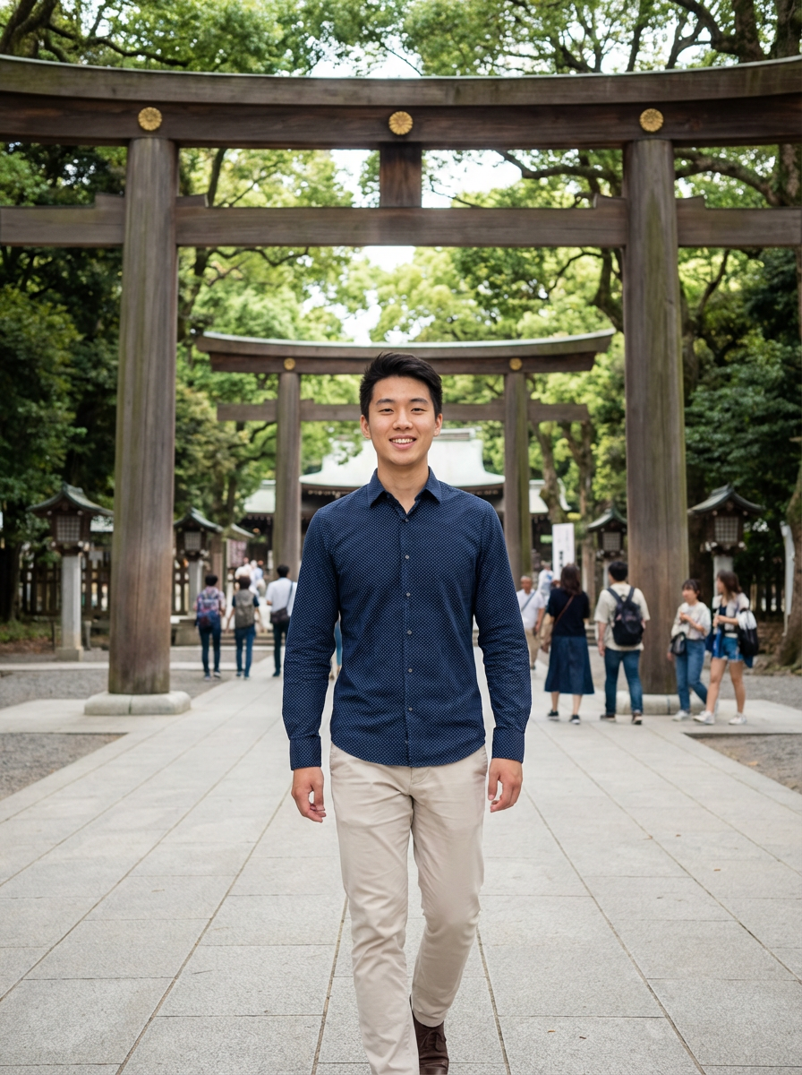 model at Meiji Shrine, wearing neat chinos with a collared shirt, walking through torii gates