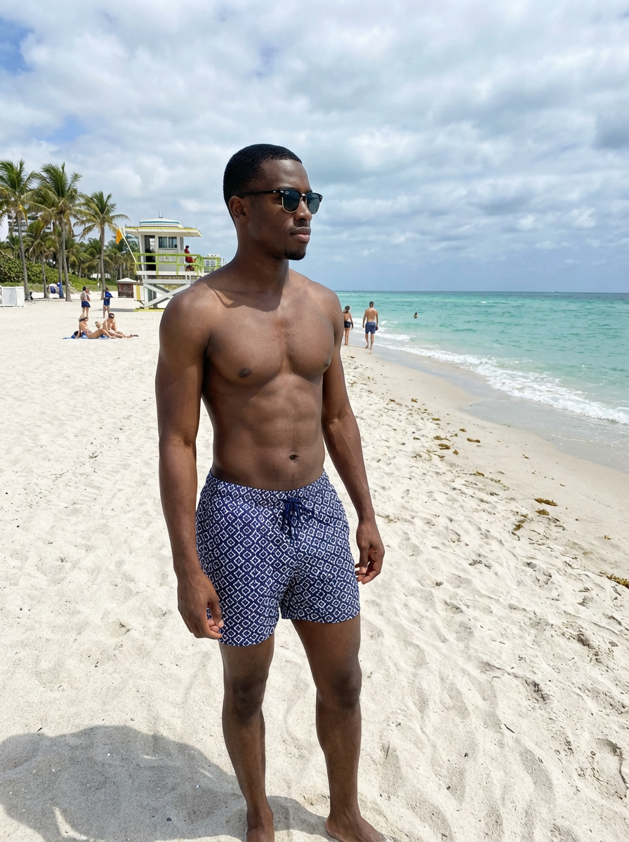 model at Miami Beach, turquoise water, white sand, stylish swimwear, perfect beach body shot