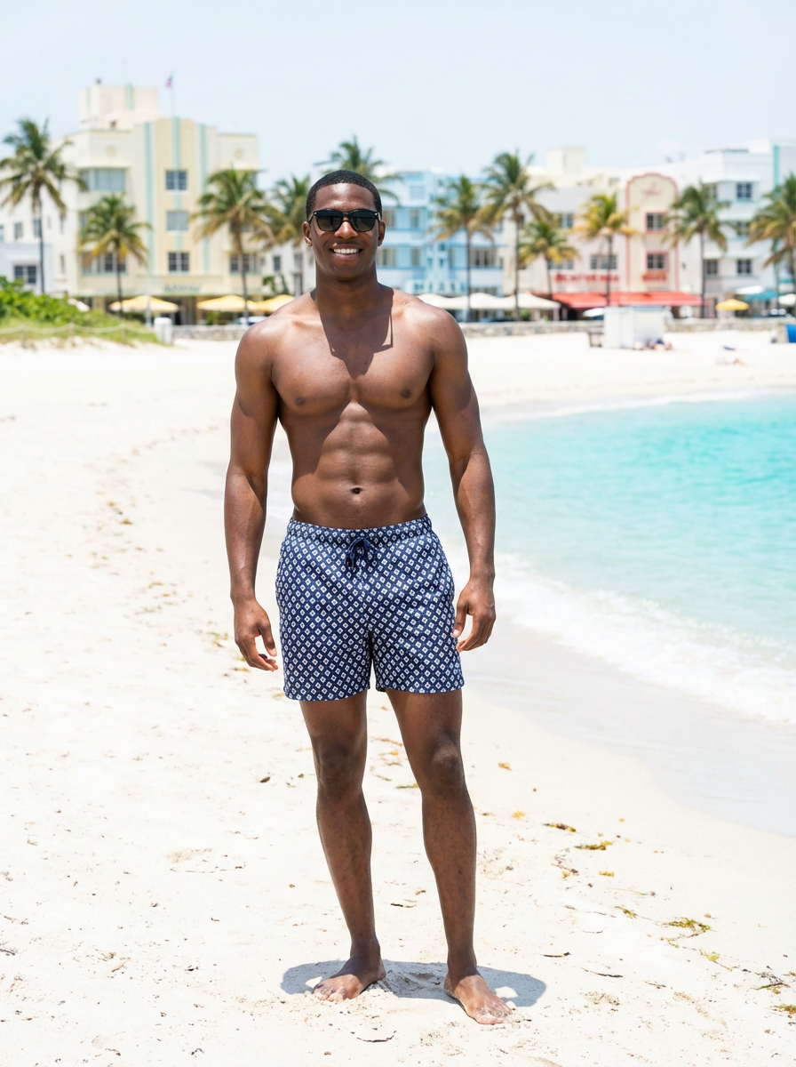 model at Miami Beach, turquoise water, white sand, stylish swimwear, perfect beach body shot