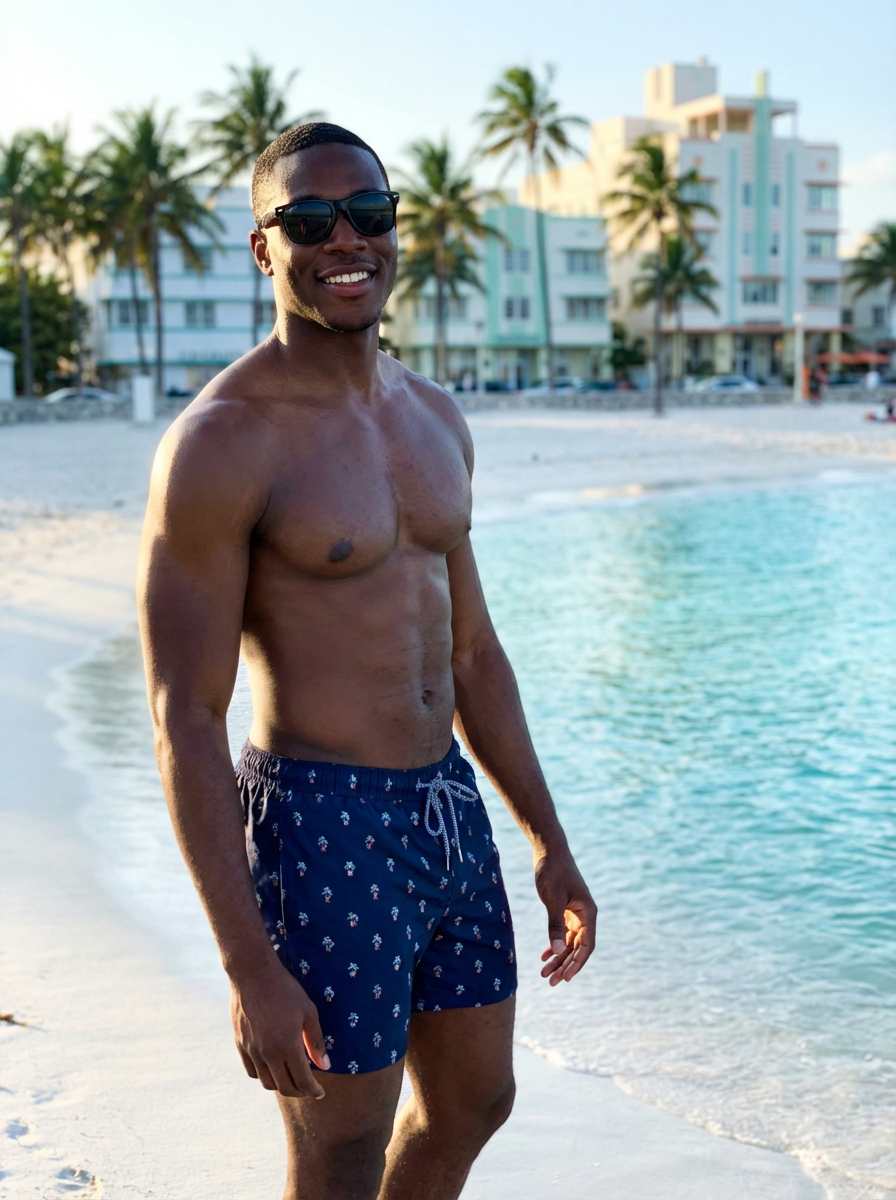 model at Miami Beach, turquoise water, white sand, stylish swimwear, perfect beach body shot