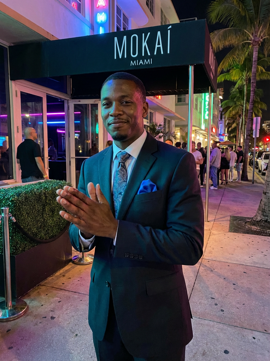 model at Miami night club entrance, South Beach nightlife, glamorous evening outfit, neon lights