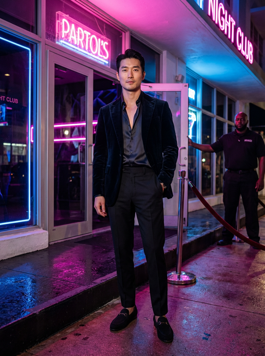 model at Miami night club entrance, South Beach nightlife, glamorous evening outfit, neon lights