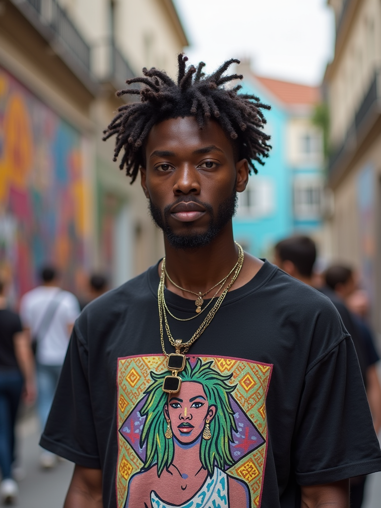 model at Montmartre art district, wearing casual artistic t-shirt with accessories, surrounded by street artists