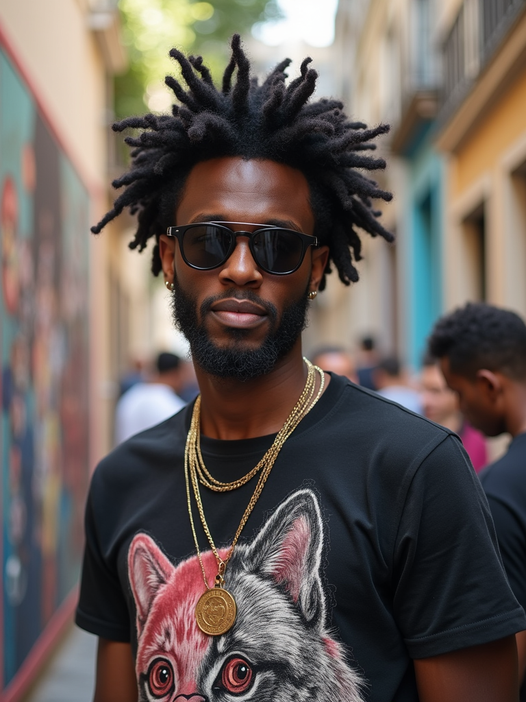 model at Montmartre art district, wearing casual artistic t-shirt with accessories, surrounded by street artists