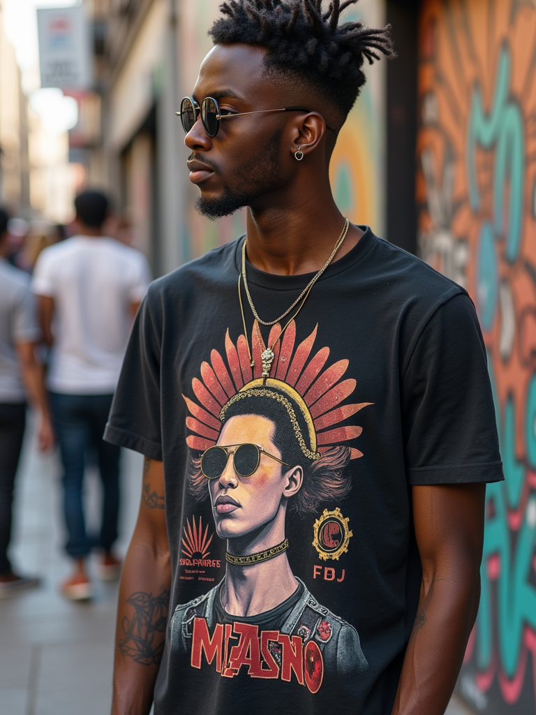 model at Montmartre art district, wearing casual artistic t-shirt with accessories, surrounded by street artists