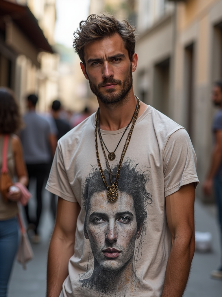 model at Montmartre art district, wearing casual artistic t-shirt with accessories, surrounded by street artists