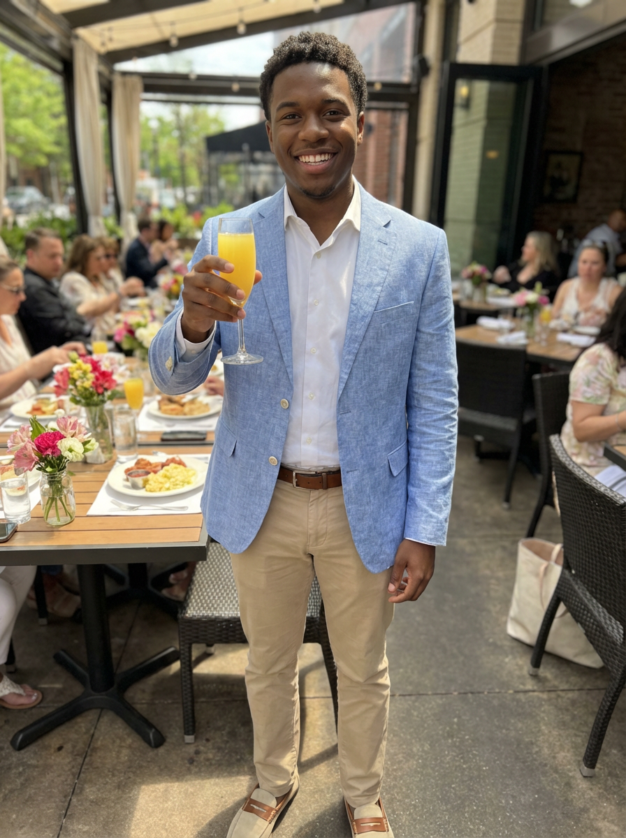 model at Mothers Day brunch, elegant table setting, spring outfit, mimosa toast, restaurant or garden setting