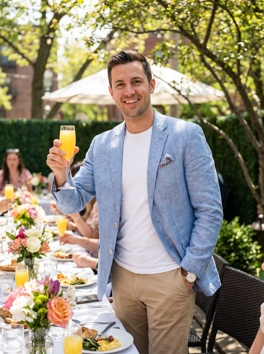 model at Mothers Day brunch, elegant table setting, spring outfit, mimosa toast, restaurant or garden setting