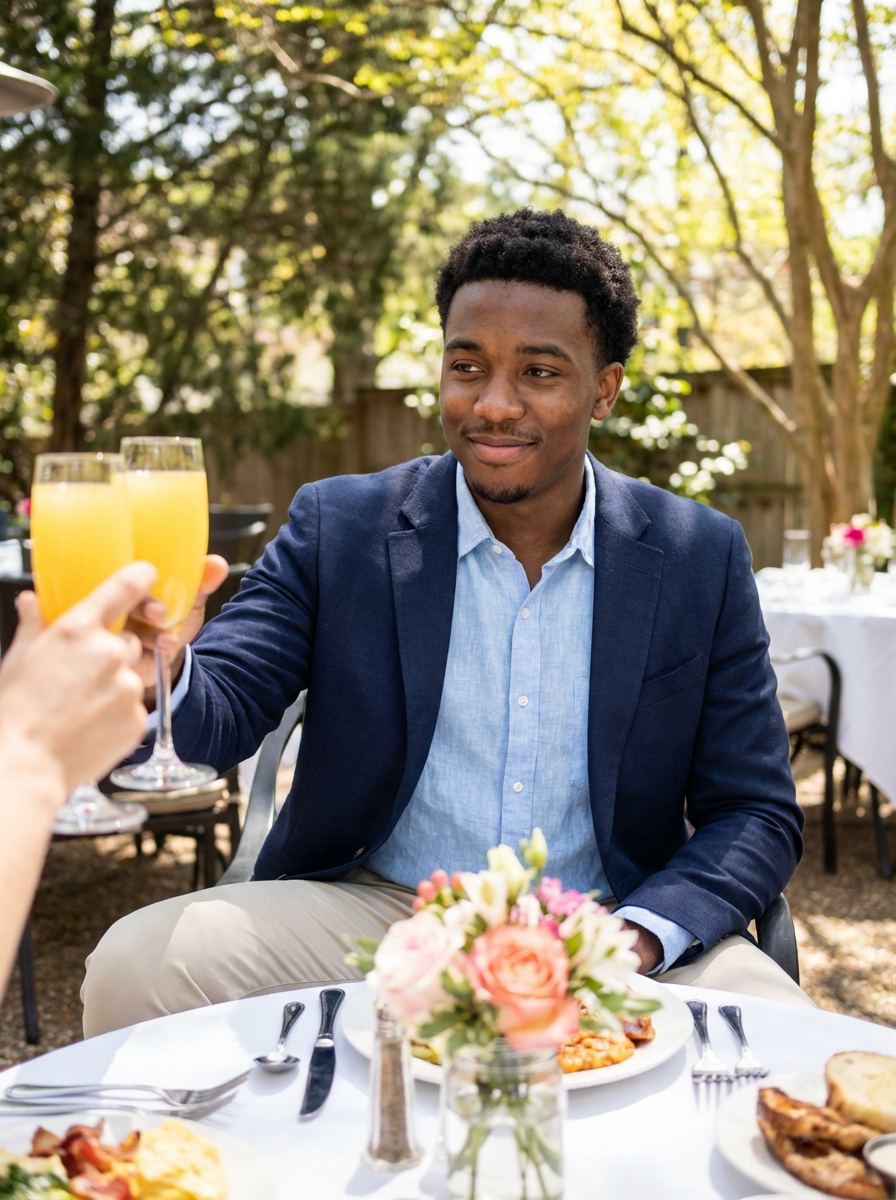 model at Mothers Day brunch, elegant table setting, spring outfit, mimosa toast, restaurant or garden setting