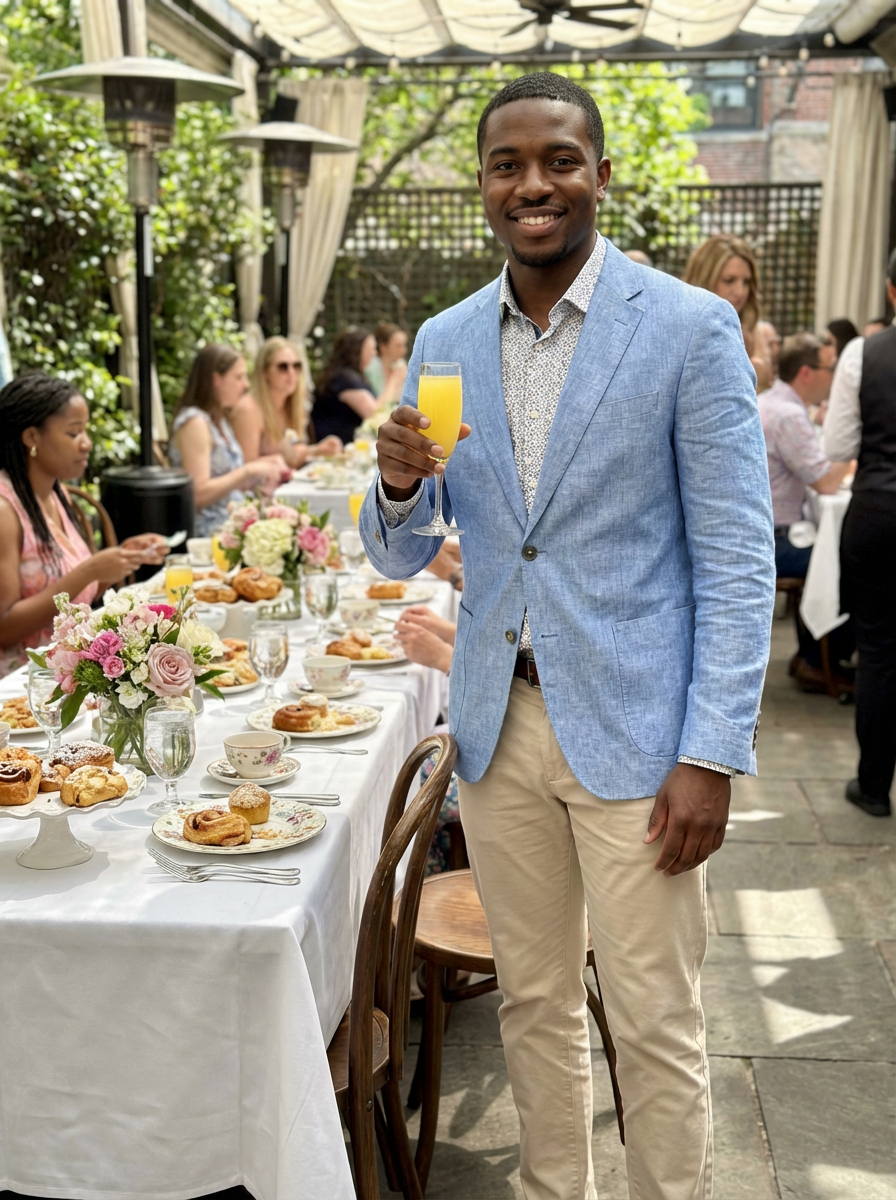 model at Mothers Day brunch, elegant table setting, spring outfit, mimosa toast, restaurant or garden setting