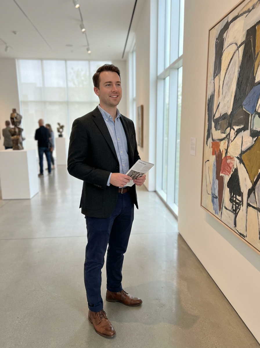 model at museum or gallery, cultured interests, smart casual attire, artistic background