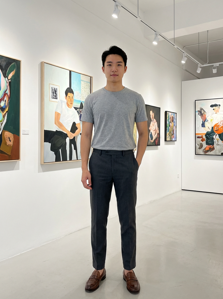 model at museum or gallery, cultured interests, smart casual attire, artistic background