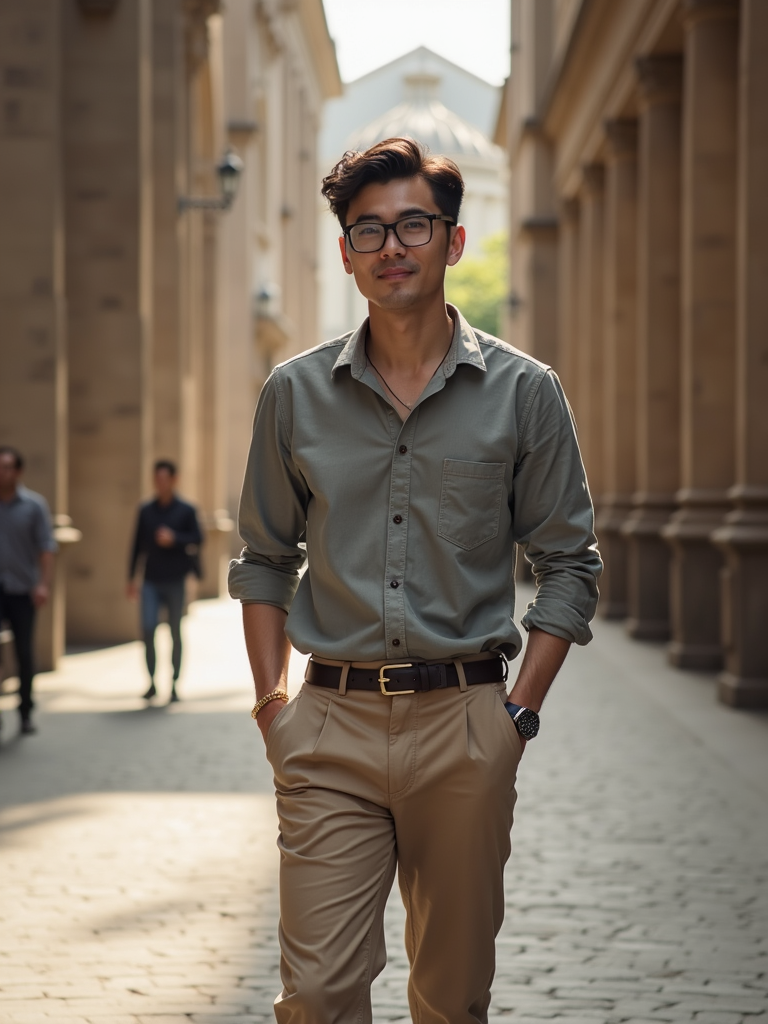 model at Notre-Dame Cathedral, wearing neat chinos with a collared shirt, walking through historic architecture