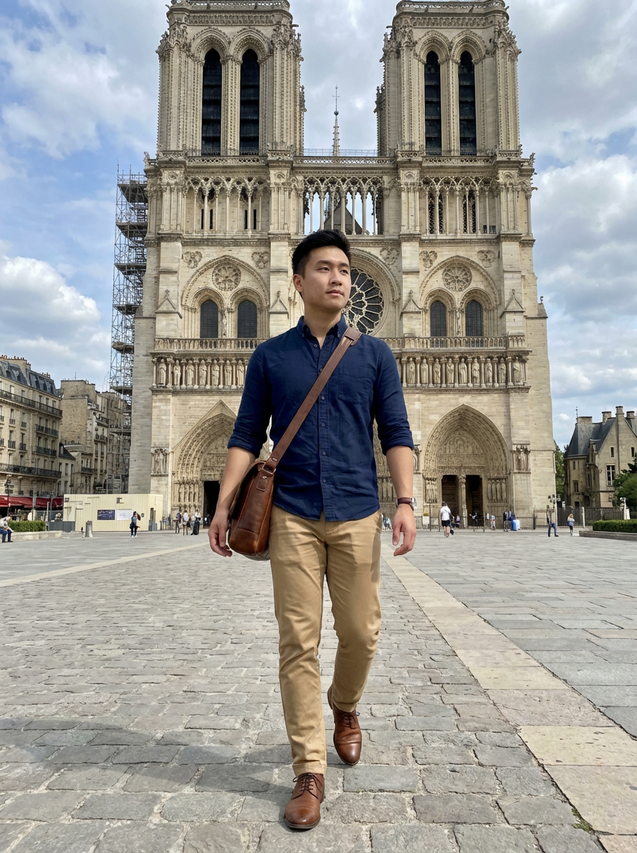 model at Notre-Dame Cathedral, wearing neat chinos with a collared shirt, walking through historic architecture