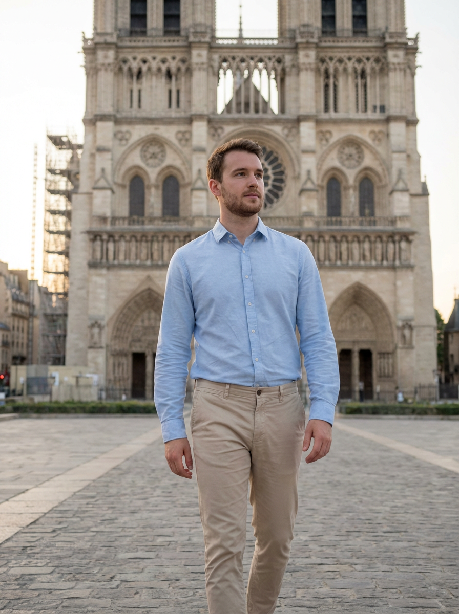 model at Notre-Dame Cathedral, wearing neat chinos with a collared shirt, walking through historic architecture
