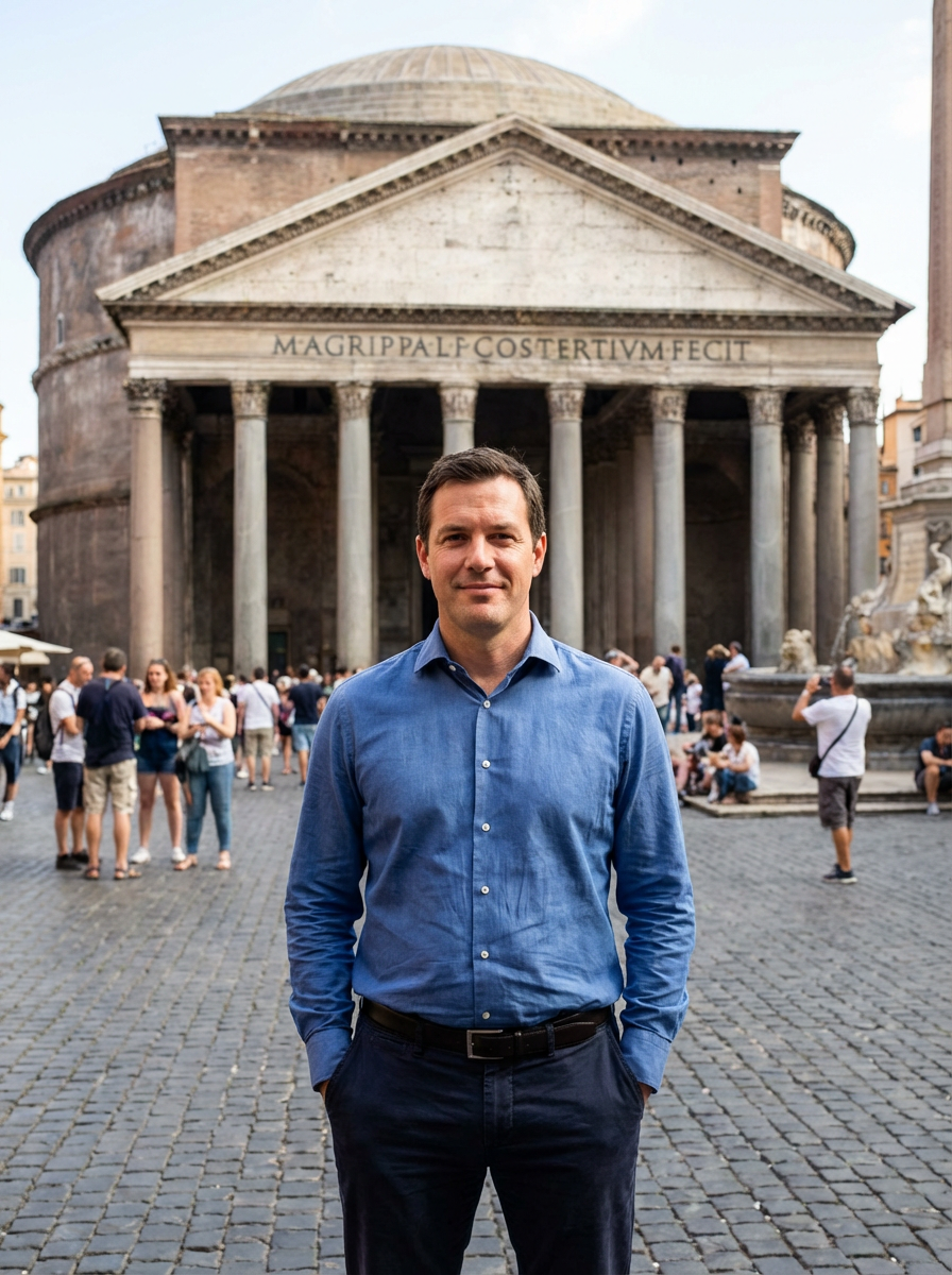 model at Pantheon, impressive dome, stylish summer attire, piazza scene