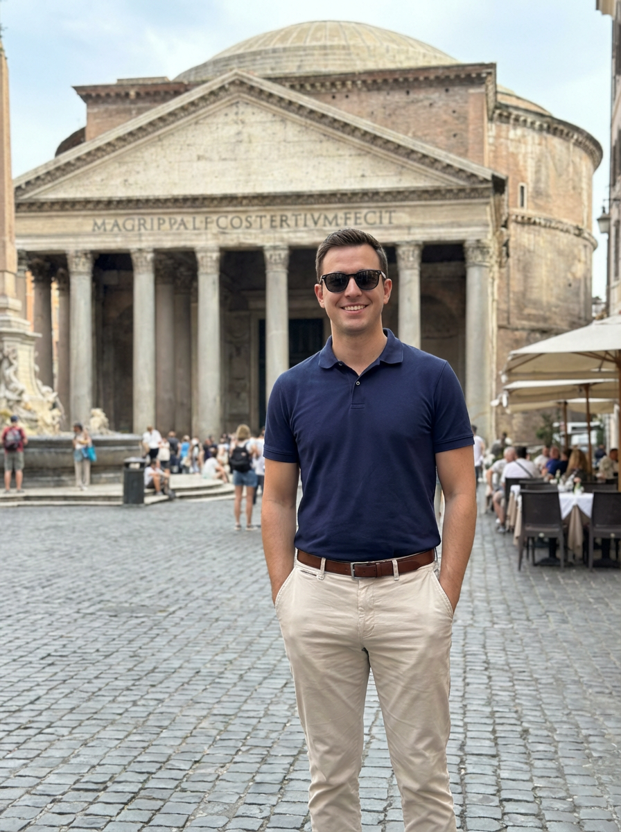 model at Pantheon, impressive dome, stylish summer attire, piazza scene
