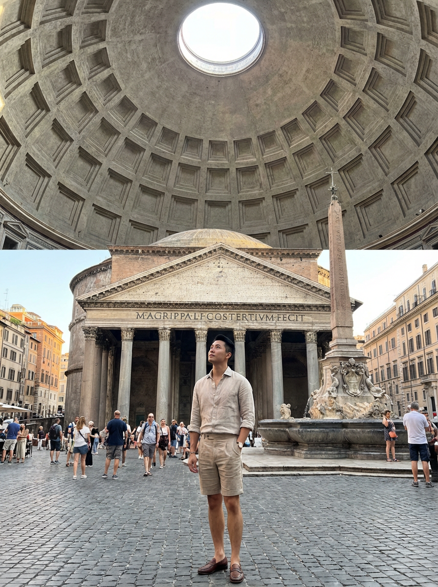 model at Pantheon, impressive dome, stylish summer attire, piazza scene