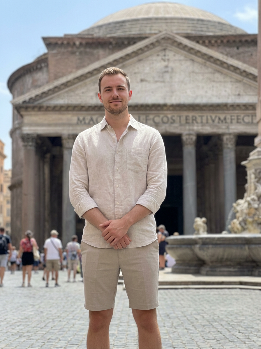 model at Pantheon, impressive dome, stylish summer attire, piazza scene