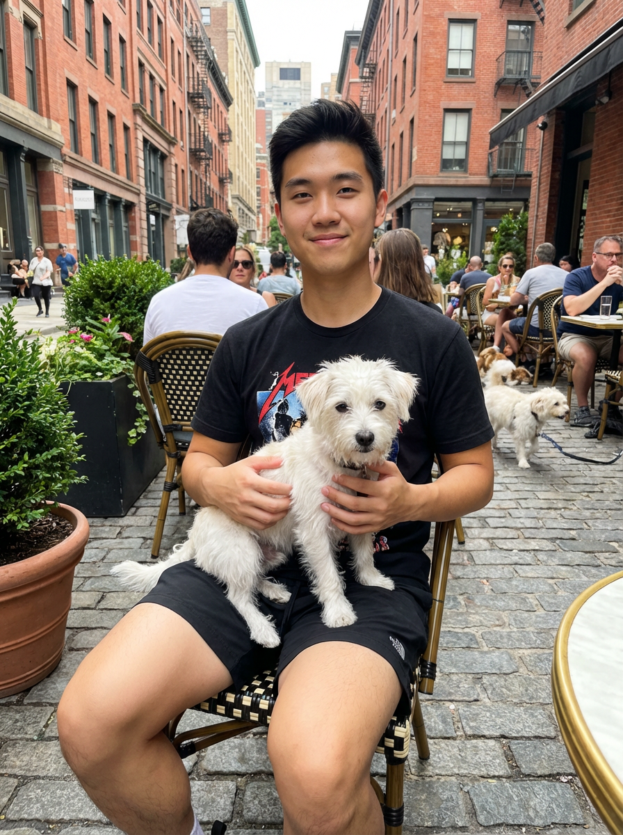 model at pet-friendly cafe with well-behaved dog, outdoor seating, urban setting