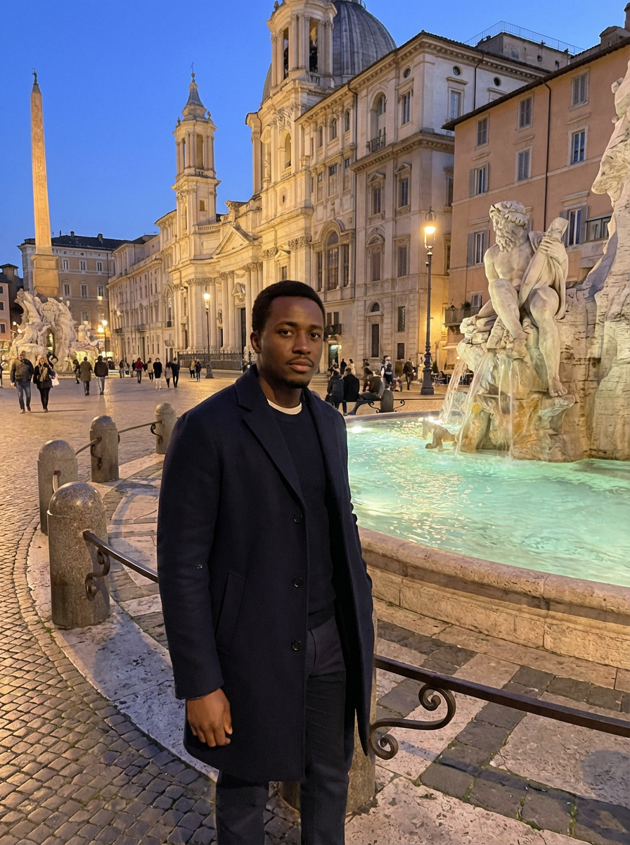 model at Piazza Navona, baroque fountains, evening passeggiata style, romantic atmosphere