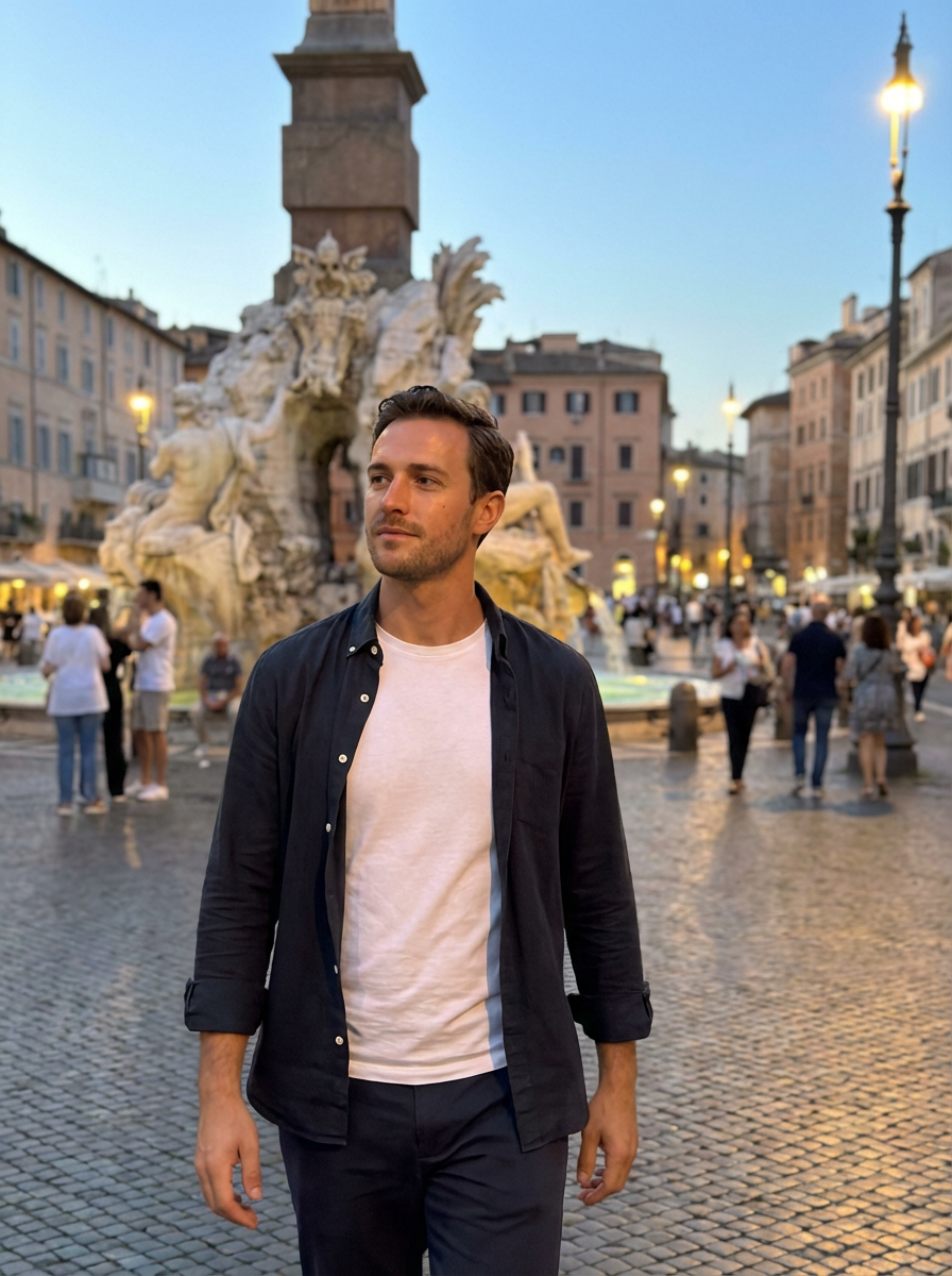 model at Piazza Navona, baroque fountains, evening passeggiata style, romantic atmosphere